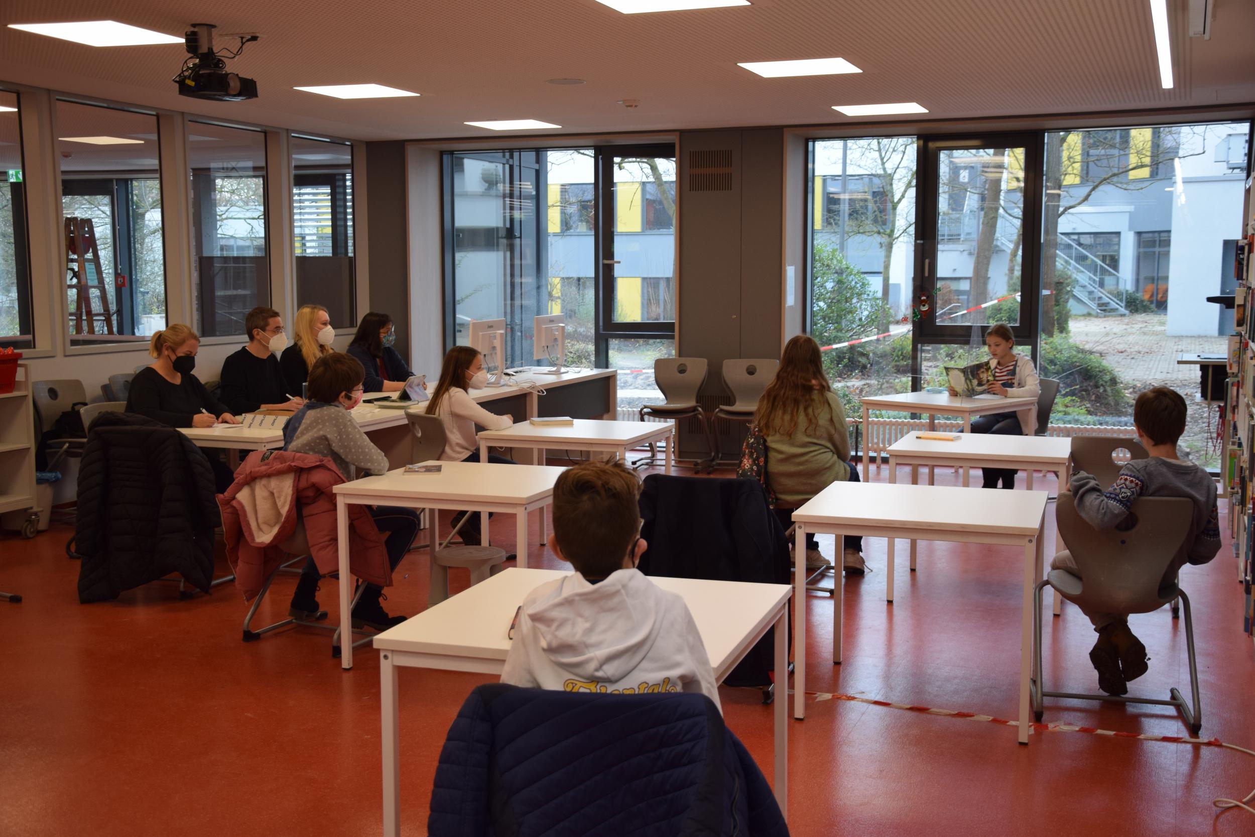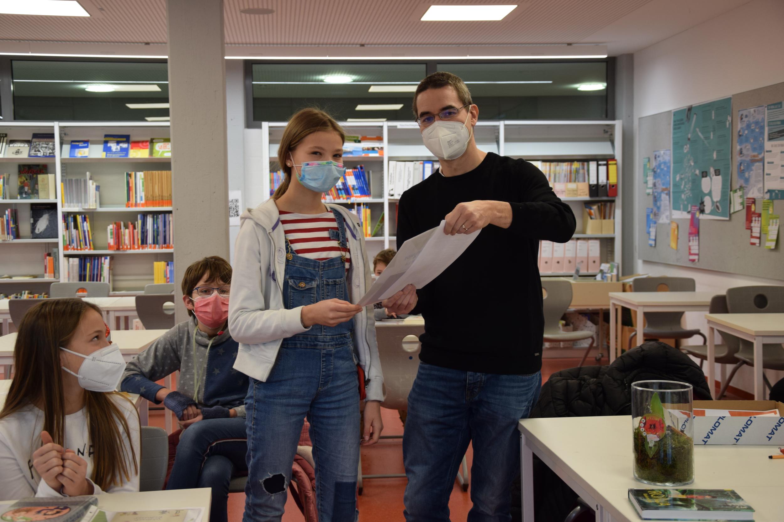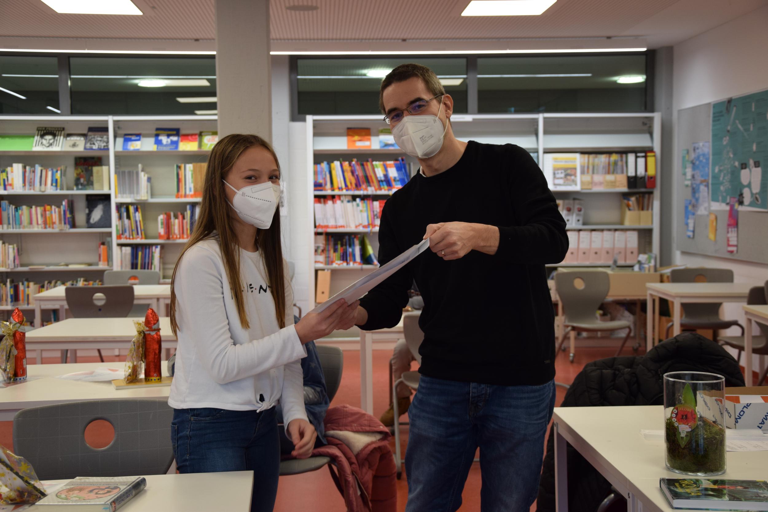 Charlotte Blumberg aus der Klasse 6A las aus Katja Brandis Jugendbuch „Woodwalkers, Carags Verwandlung“ vor. Franziska Vesenmaier aus der Klasse 6C präsentierte einen Auszug aus „Die Vampirschwestern. Eine Freundin zum Anbeißen“ von Franziska Gehm.