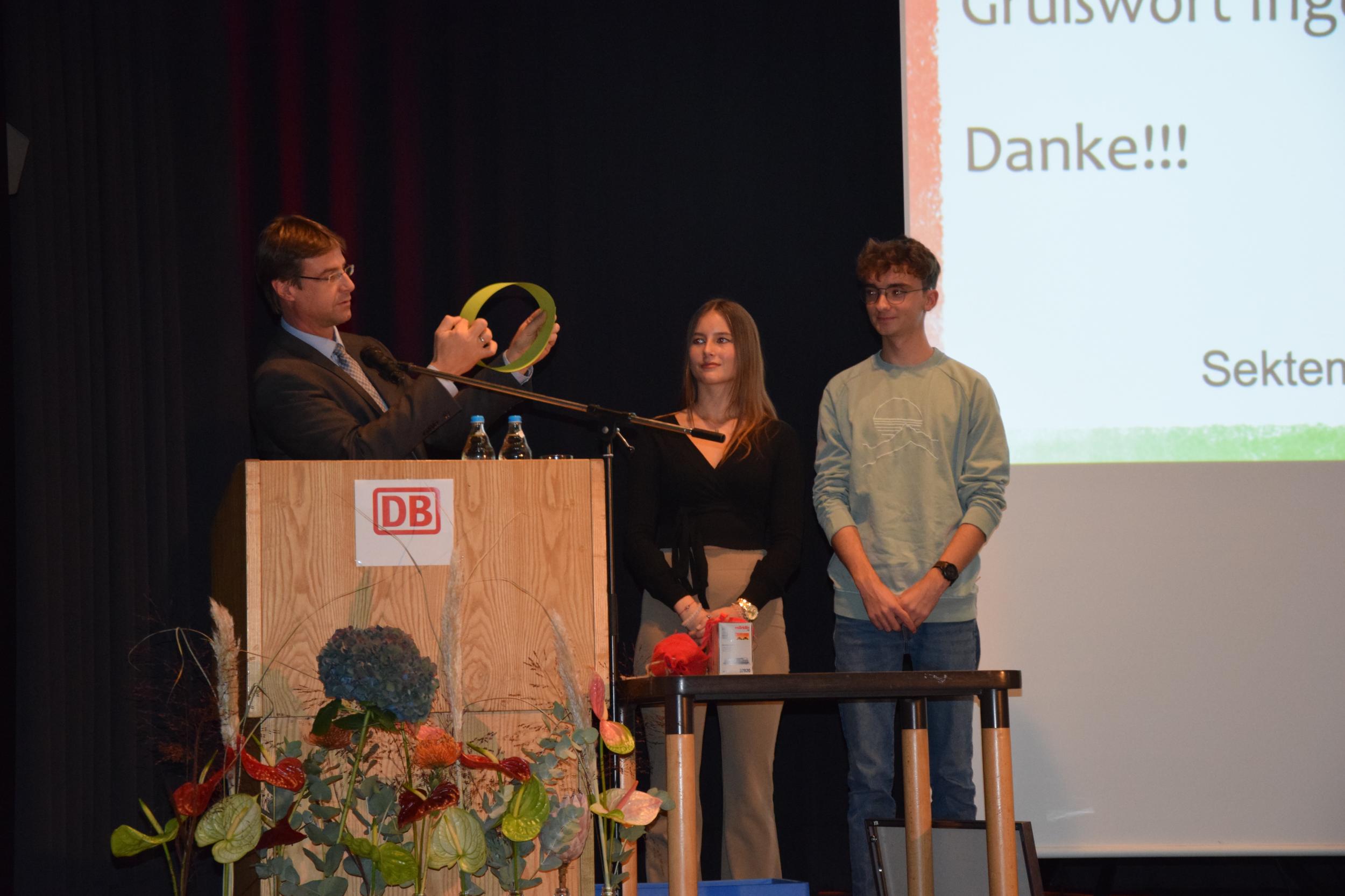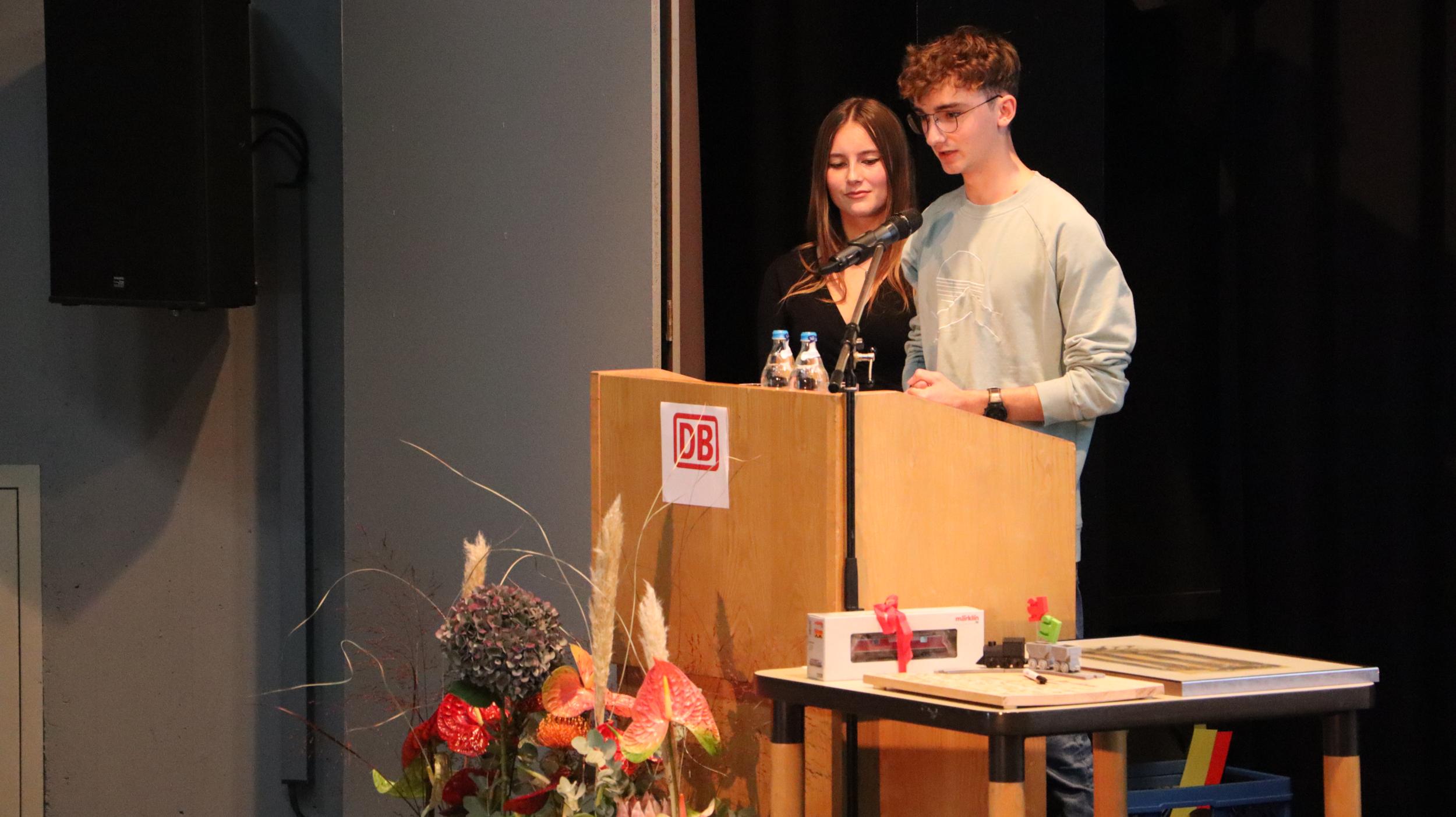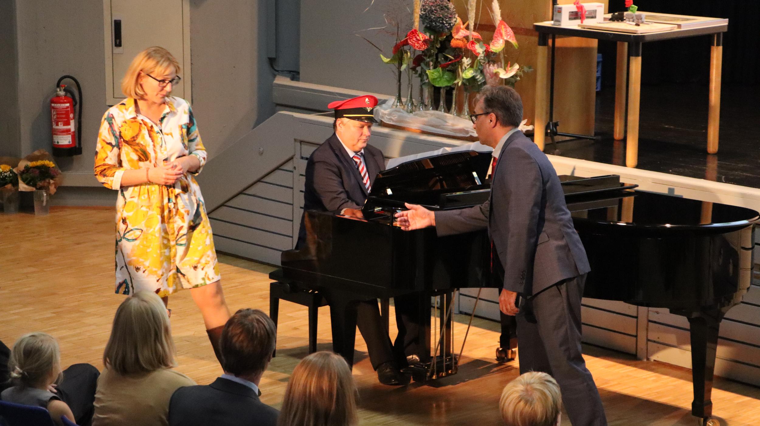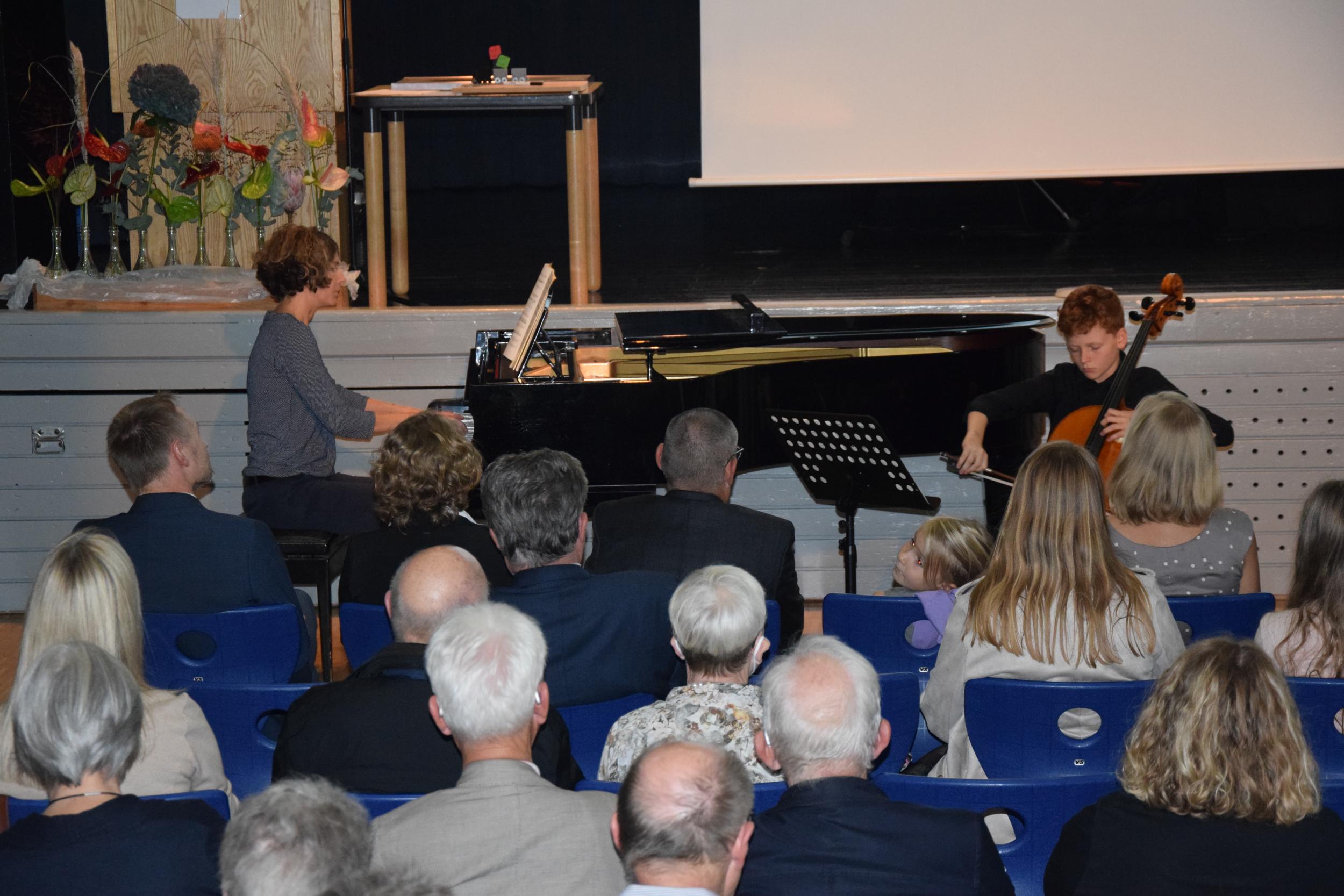 Für den musikalischen Rahmen der Veranstaltung sorgte der Siebtklässler Jakob Schiessler am Cello, auf dem Klavier begleitet von seiner Mutter. Beide spielten den 1. Satz des Concerto Nr. 3 von Georg Goltermann. Humorvolle musikalische Beiträge steuerten mit dem Duetto buffo di due Gatti von Gioachino Rossini die Schulleitung des Gymnasiums I, Nicole Stockmann und Matthias Helmle, unterstützt vom stellvertretenden Schulleiter des Gymnasiums II am Piano, Martin Schmidgall, bei. Darüber hinaus erfreute der Personalrat der Gymnasien das Publikum mit einer auf das Ellental angepassten Version des Lummerlandliedes der Augsburger Puppenkiste.