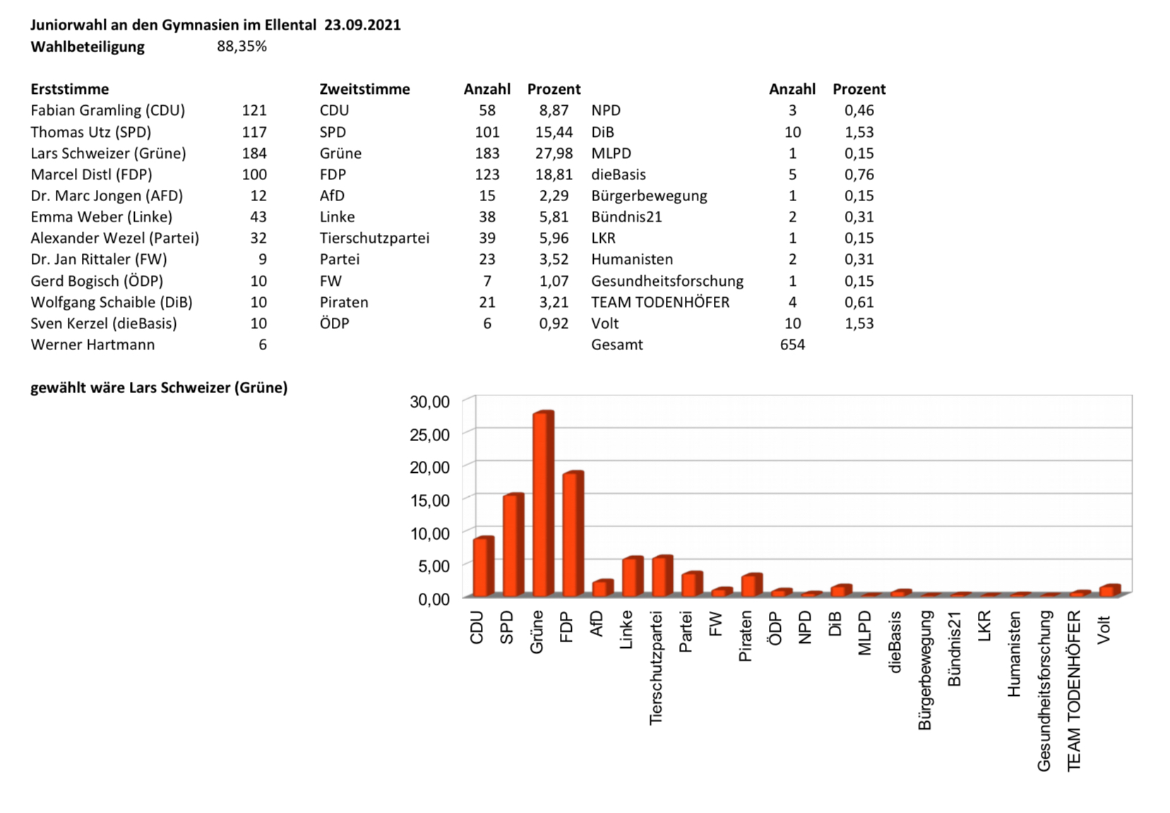 Die Ellentalgymnasien haben sich an der Juniorwahl zur Bundestagswahl 2021 mit einer phänomenalen Wahlbeteiligung von über 88 Prozent beteiligt. Alle Schülerinnen und Schüler der Stufen 8-J2 konnten vor der Bundestagswahl ihre Stimme abgeben. Die Ergebnisse der Ellentalgymnasien finden sich hier im Anhang.