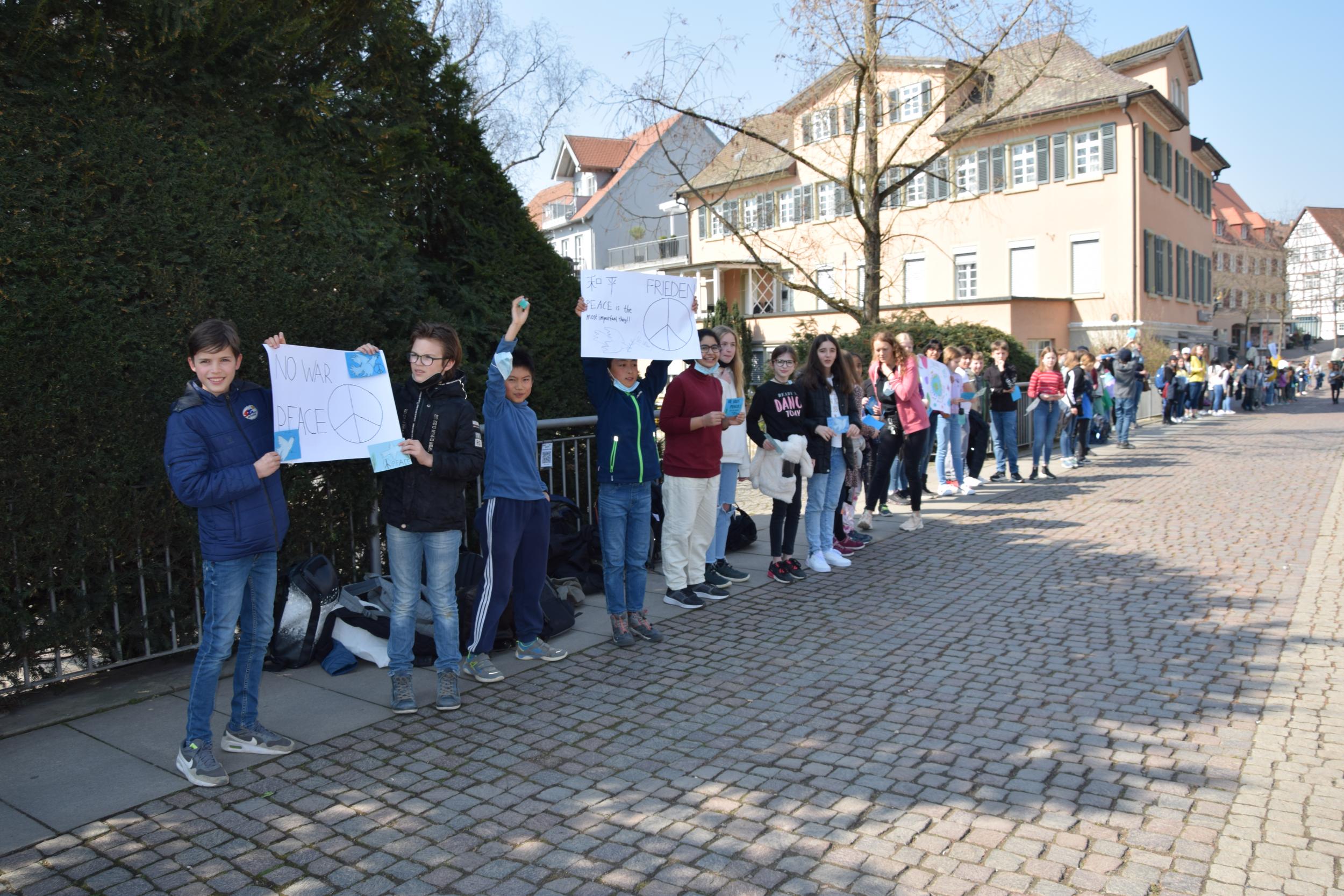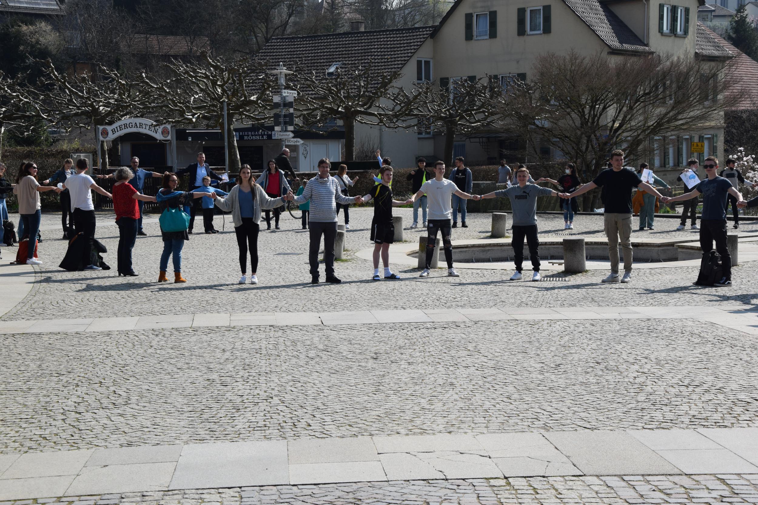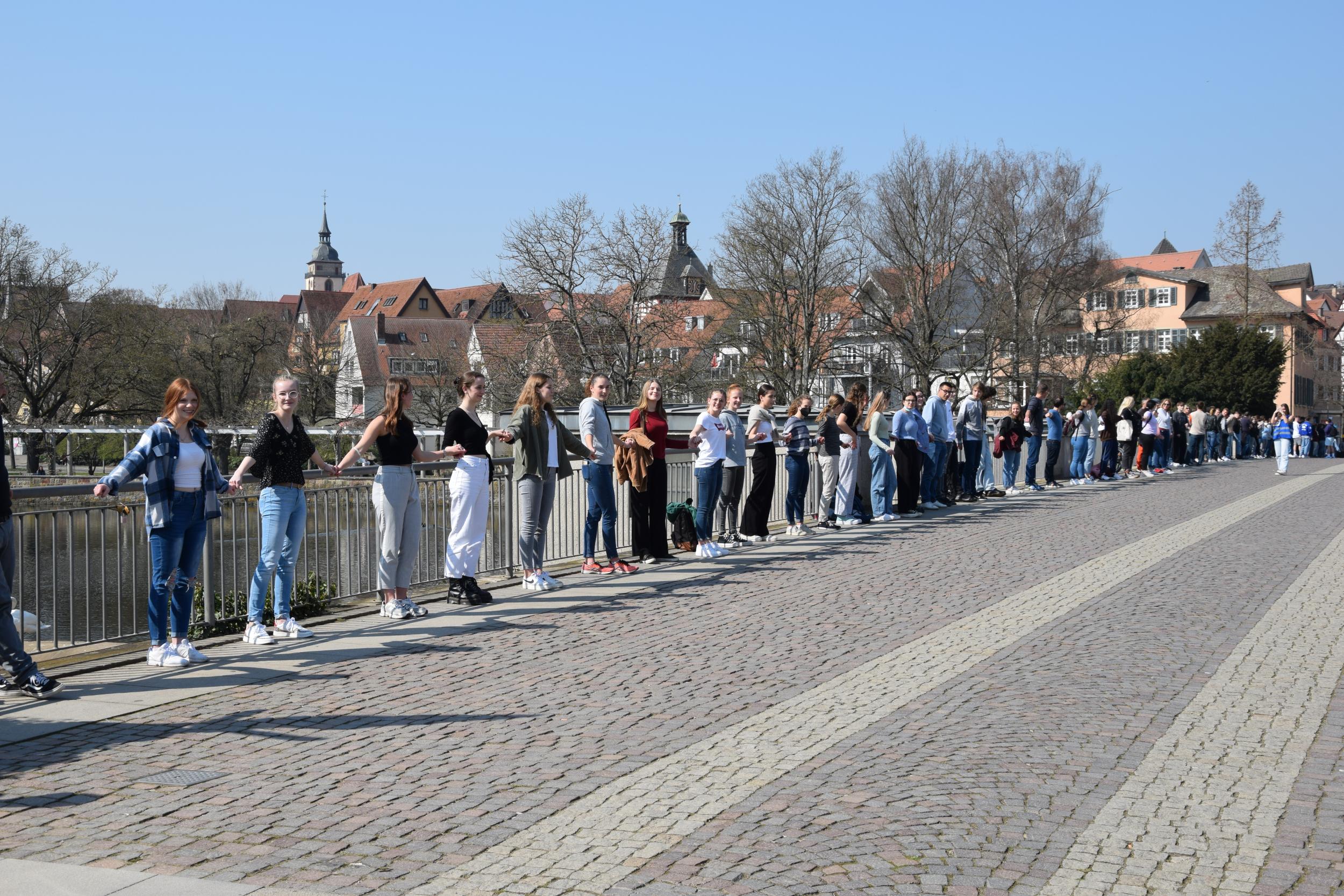 Auf fast drei Kilometer brachte es die Menschenkette aller Bietigheim-Bissinger Schulen, die sich am 25. März 2022 gegen 12.30 Uhr durch die Innenstadt über den Bürgergarten an der Enz entlang bis ins Ellental zog und an der sich auch die Gymnasien im Ellental beteiligten. Obwohl die Aktion freiwillig war, zeigte ein beachtlicher Teil der Schülerschaft und Lehrkräfte Flagge gegen den Krieg.