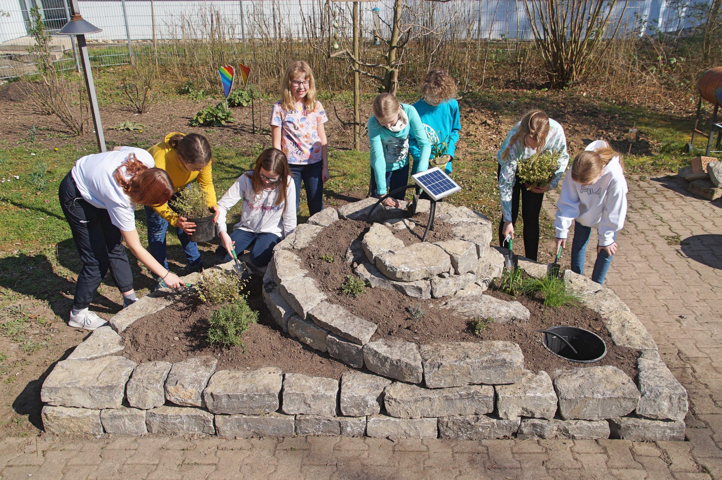 Tatkräftige Unterstützung erhalten sie von der Natur-AG, die sich einmal wöchentlich trifft, um den Garten zu pflegen. Immer wieder werden auch neue Biotope anlegt und damit für eine große Artenvielfalt gesorgt. Zu einem Schmetterlingsbeet kamen - Dank des großen Einsatzes der naturbegeisternten Schülerinnen und Schüler - ein Beerengarten, Vogelnistkästen, Fledermauskästen, Futterstellen für Vögel und Eichhörnchen, sowie ein Steinhabitat für Molche und Eidechsen dazu. Seit März 2022 gibt es eine Kräuterschnecke und seit Juni 2021 steht eine Einraumbeute mit einem Schwarm Honigbienen im Schulgarten. Eine Bienen-AG wird die Bienen betreuen und erforschen.