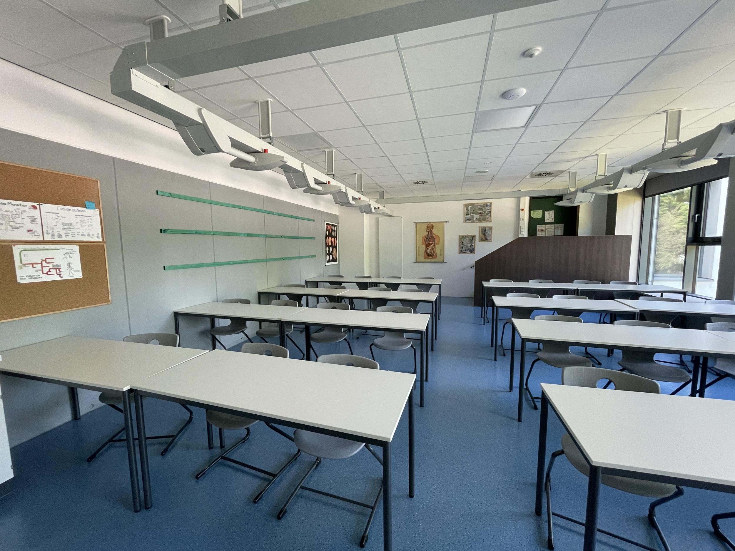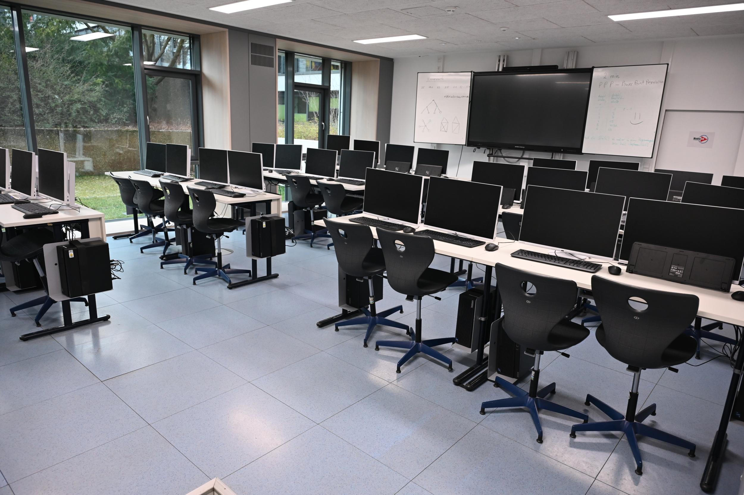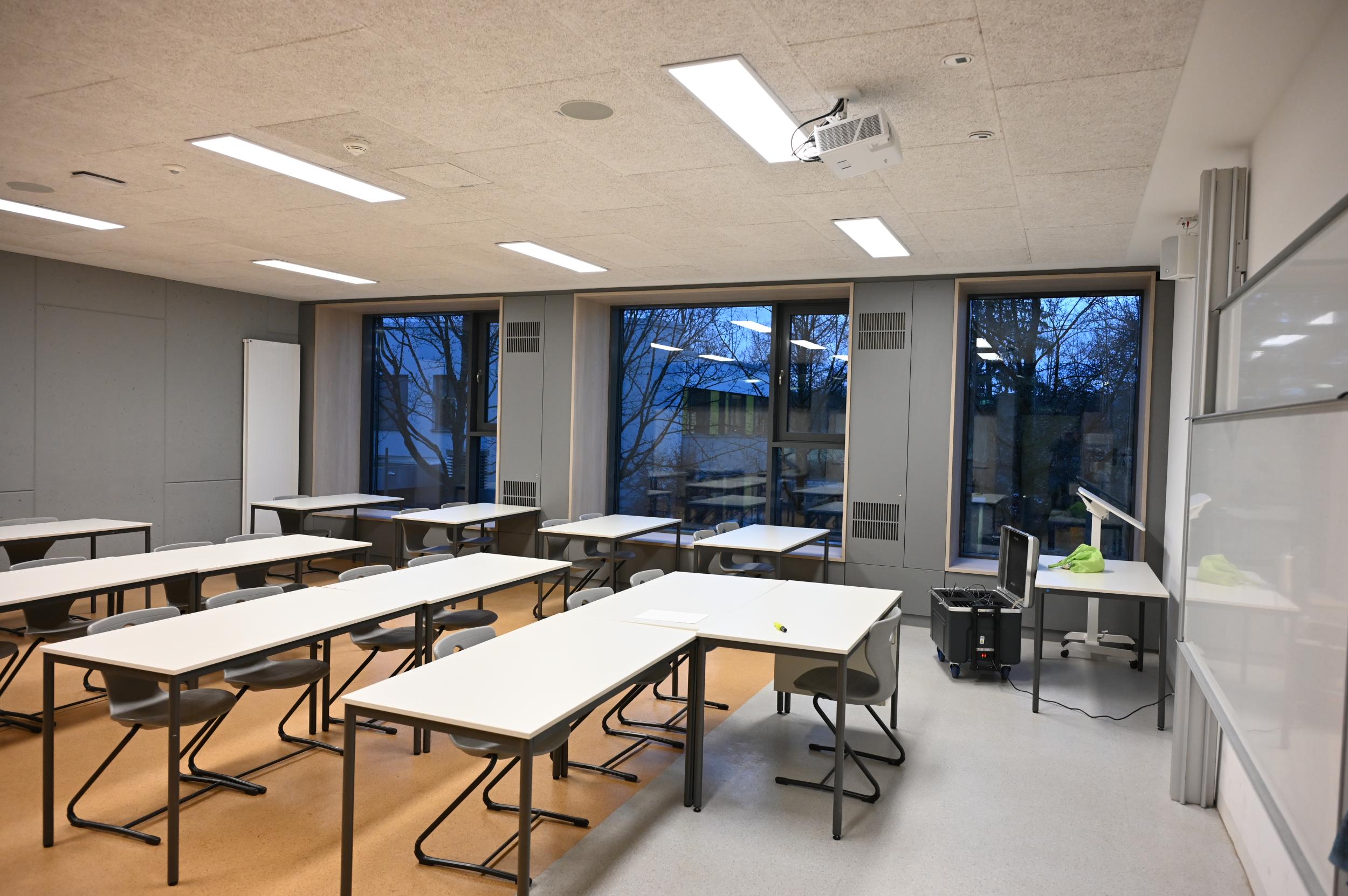 Unsere Räume sind alle mit Beamer, AppleTV und großer Projektionsfläche ausgestattet. Etwa ein Drittel der Räume erhalten anstatt Beamer interaktive Displays. Alle Gebäudeteile verfügen über eine WLAN-Ausleuchtung.