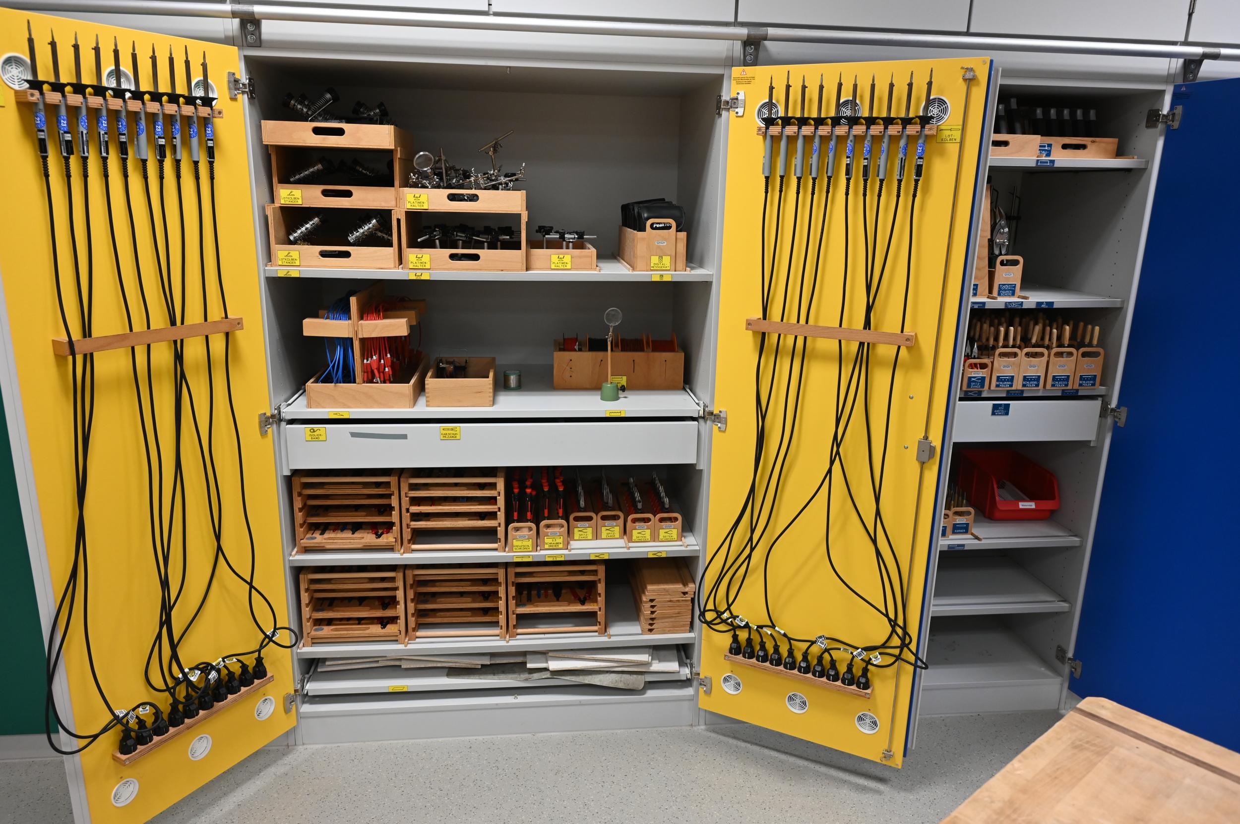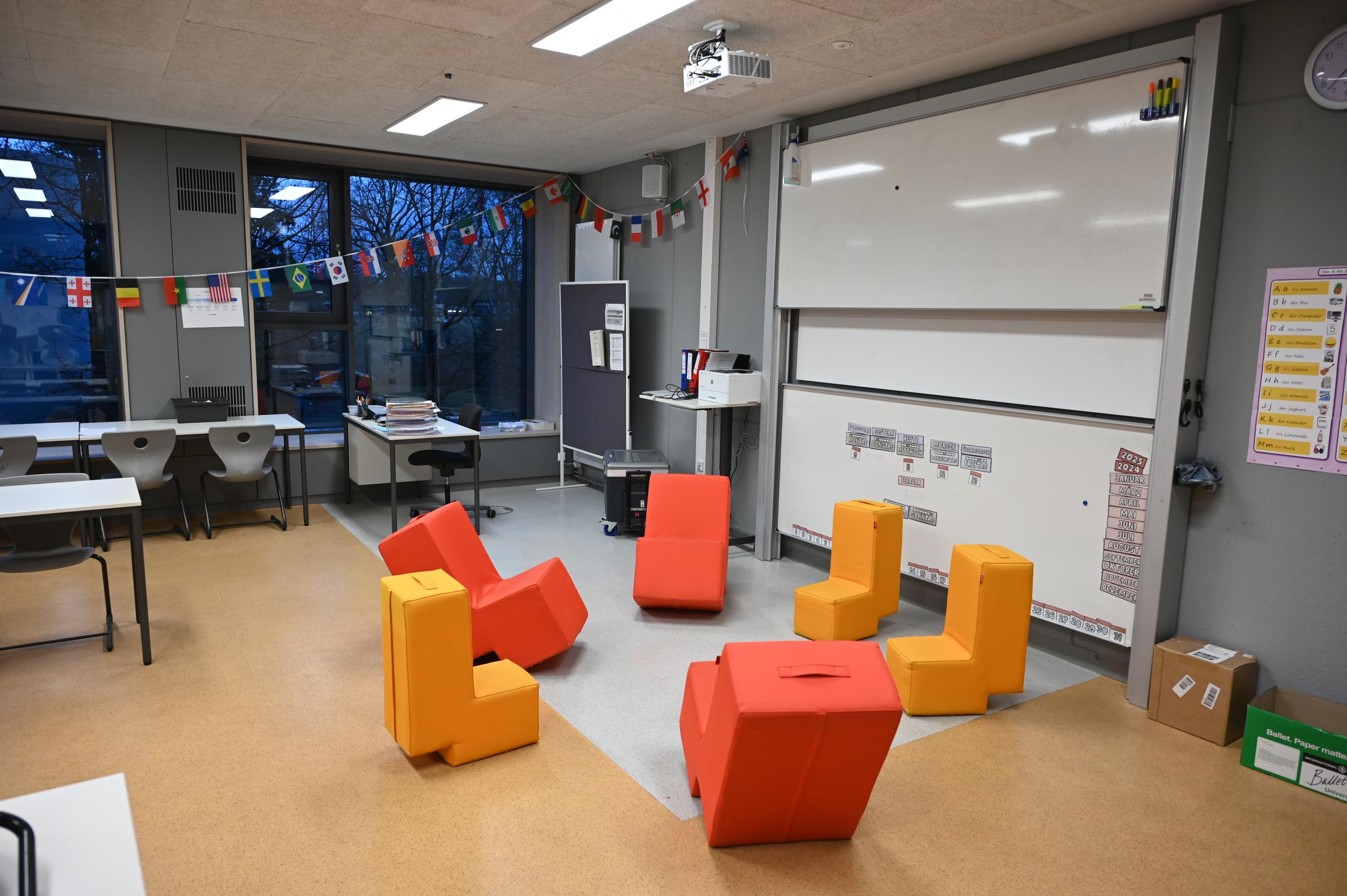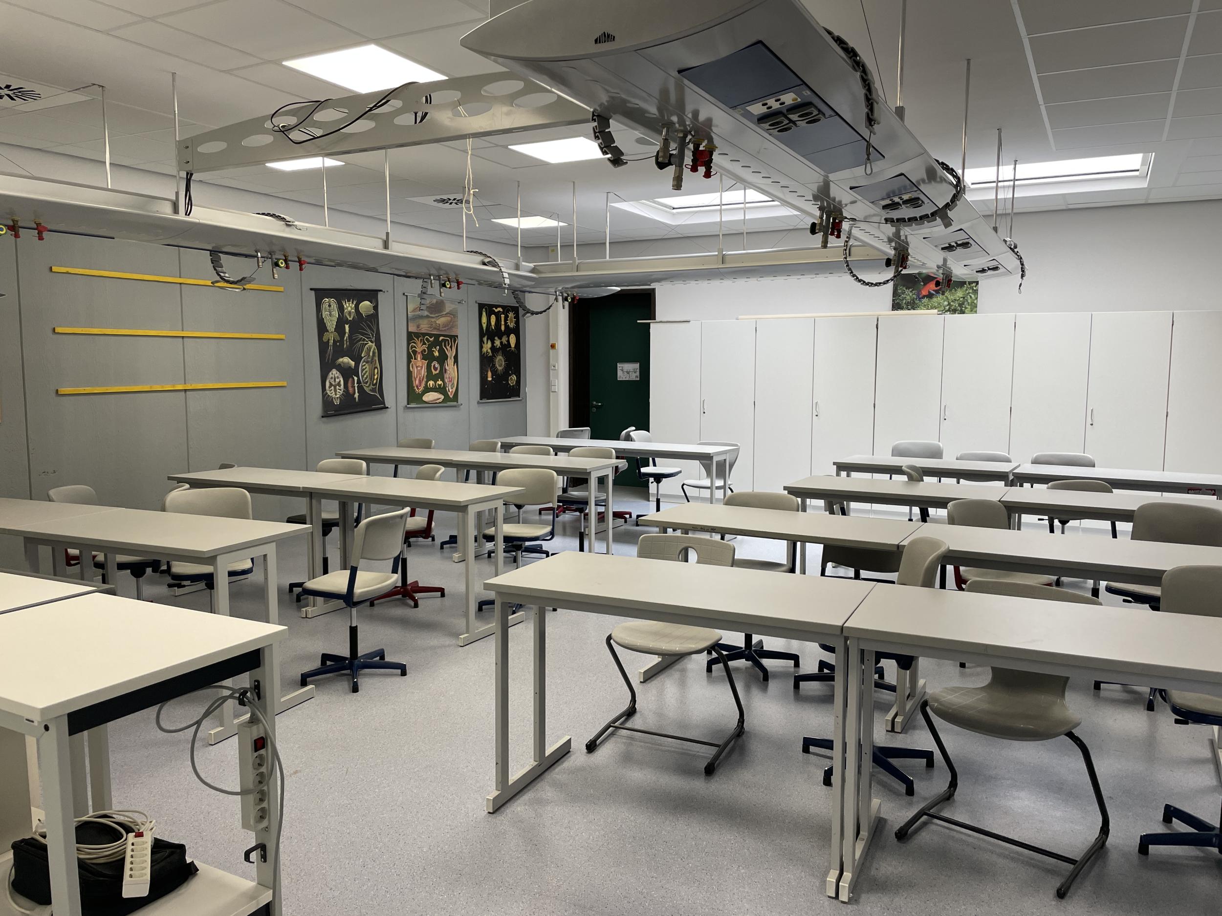 Unsere Räume sind alle mit Beamer, AppleTV und großer Projektionsfläche ausgestattet. Etwa ein Drittel der Räume erhalten anstatt Beamer interaktive Displays. Alle Gebäudeteile verfügen über eine WLAN-Ausleuchtung.